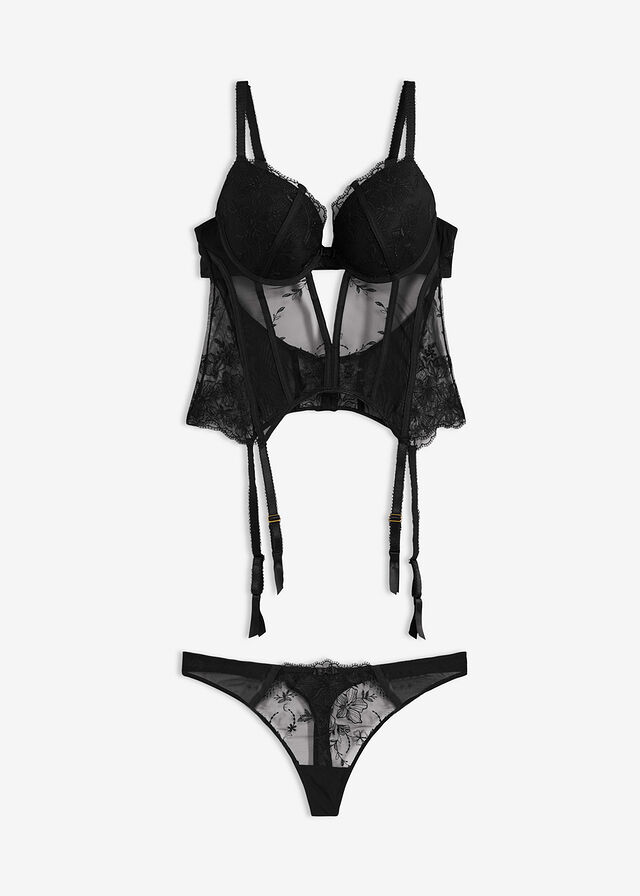 | Materiaali | Pintamateriaali: Korsetti: 83% polyamidi, 17% elastaani, Pikkuhousut: 83% polyamidi, 17% elastaani |